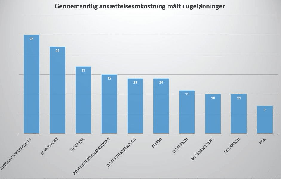 Som det kan ses, koster det 25 ugers løn at ansætte en automationstekniker, mens en kok blot koster 7 ugers løn. Den store forskel kan sandsynligvis forklares af udbud og efterspørgsel, samt hvor komplekst jobbet er.