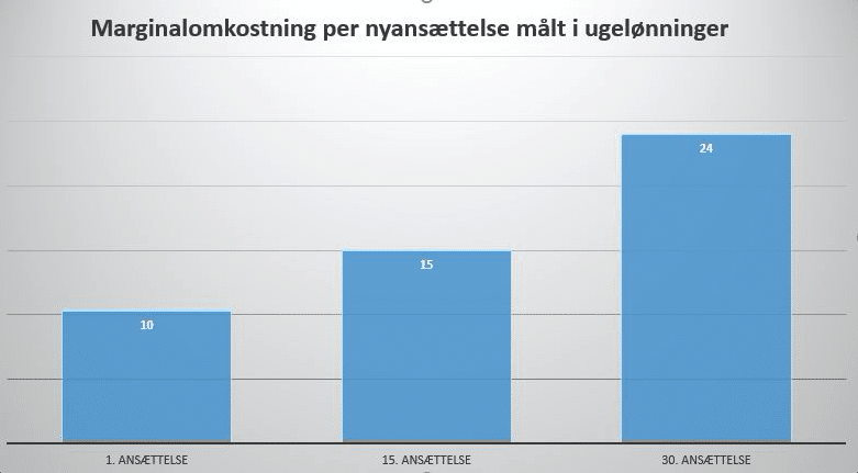 Hvad sker der med omkostningerne, når man skal ansætte flere? Man kunne antage, at der ville være stordriftsfordele ved at lave mange nyansættelser. Dette ser imidlertid ikke ud til at være tilfældet. Tværtimod, marginalomkostningen for nyansættelser er generelt stigende (Blatter et al., 2012). Som det kan ses i diagrammet nedenfor, er den 30. ansættelse inden for en 3-årig periode 2,4 gange så dyr som den første ansættelse.