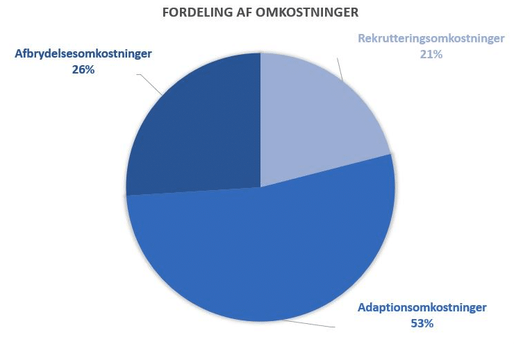 Deres studie viser altså, at 79 pct. af omkostninger pådrages efter ansættelse. Dog skal der her tages højde for, at deres studie ikke inkluderer omkostninger forbundet med generelle employer branding-aktiviteter. Kigger vi nærmere på adaptionsomkostningerne viser tallene, at det tager en nyansat cirka 80 dage at ramme det gennemsnitlige produktivitetsniveau, og i denne periode er vedkommende i gennemsnit 30 pct. mindre effektiv (Blatter et al., 2012; Muehlemann & Pfeifer, 2016; Muehlemann & Leiser, 2018). Den relativt store omkostning forbundet med afbrydelsesomkostninger skyldes, at de øvrige ansatte i gennemsnit bruger 99 timer på uformel oplæring af den nyansatte (Muehlemann & Leiser, 2018).