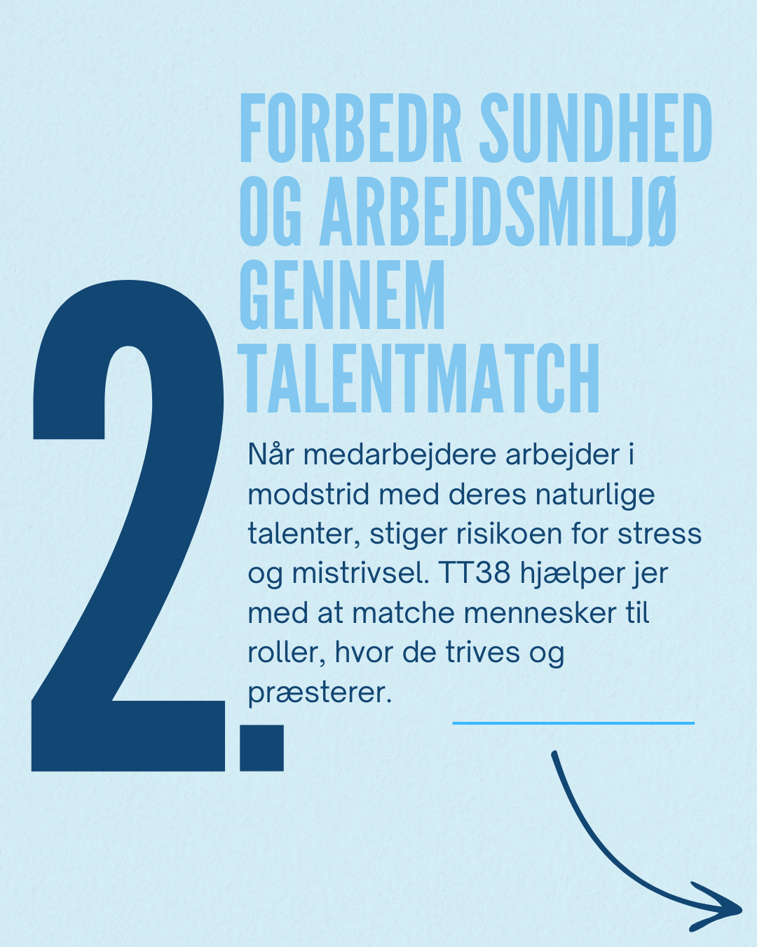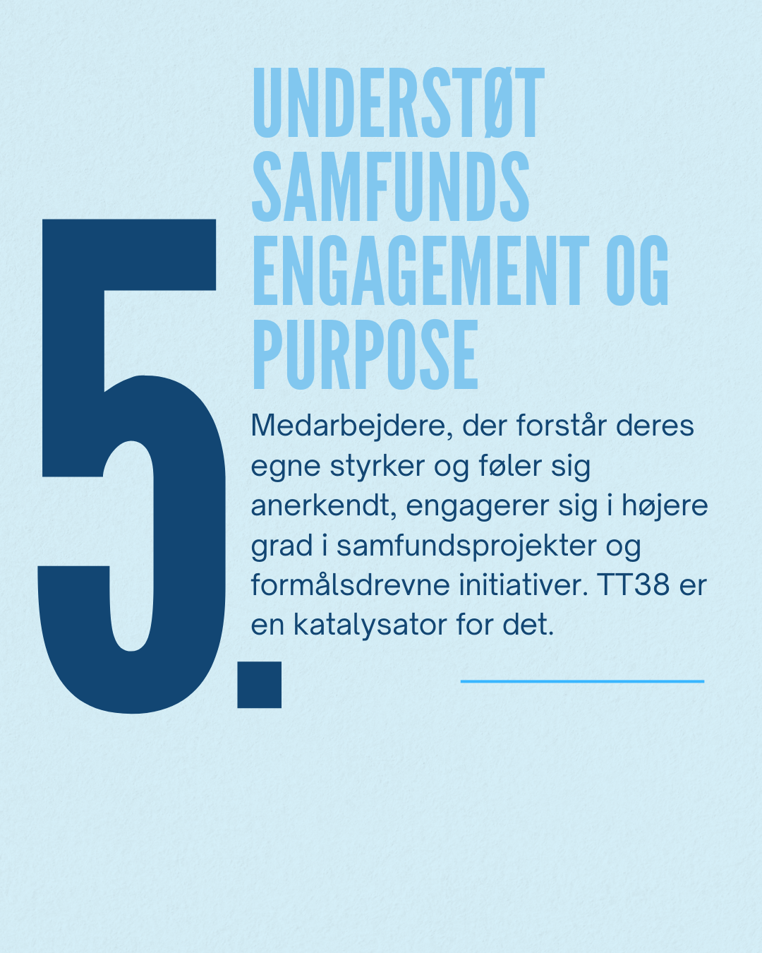 TT38 Talent Testen hjælper jer med at gøre det sociale ansvar konkret, målbart og meningsfuldt. Testen kortlægger, hvordan mennesker trives, udvikles og samarbejder i jeres organisation – og gør det muligt at dokumentere og forbedre både trivsel, diversitet og ledelse.