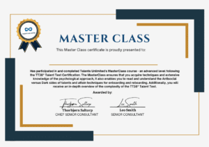 Vores Dark Side Master Class er overbygningen på din TT38 Talent Test Certificering. Dette avancerede 2-dages kursus er målrettet alle TT38 certificerede, der ønsker at udvide deres viden og få en dybere forståelse af de mere komplekse aspekter af talentudvikling – de såkaldte dark sides og blind spots.